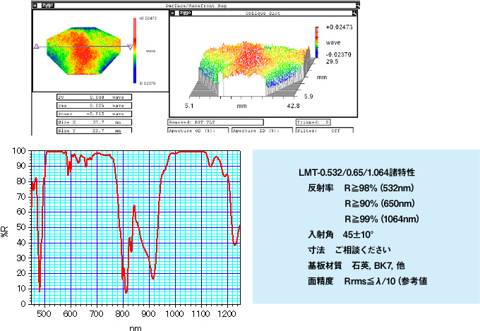 高反射仕様だけでなく、ハーフミラーなどのカスタム仕様にも対応いたします。また使用するレーザ波長やアプリケーションに合わせて基板の材質や形状もご指定いただけます。